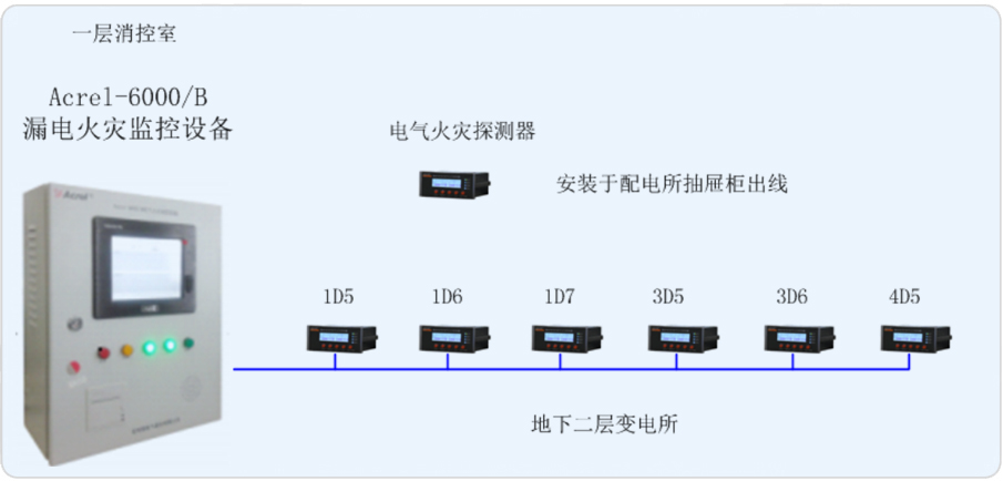 交通饭店有一个变电所,位于地下二层。变电所负责负一层超市以及地上楼层部分的用电。现为本项目设计一套漏电火灾系统,由此来实时监测变电所内重要回路的漏电流,以确保变电所配电系统的电气安全。