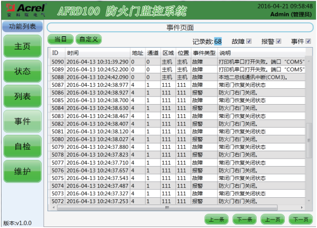 该界面可显示当前存储的报警记录、故障记录和事件记录,可选择查询当天记录也可以自定义查询日期。