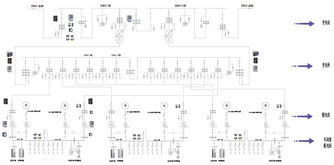 电力监控系统主要针对开闭所和10/0.4kV变电所,对高压回路配置微机保护装置及多功能仪表进行保护和监控,对0.4kV出线配置多功能计量仪表,用于测控出线回路电气参数和用能情况。同时对药企厂区重要设备如柴油发电机、无功补偿装置、有源滤波装置、UPS、隔离电源系统状态进行监测。