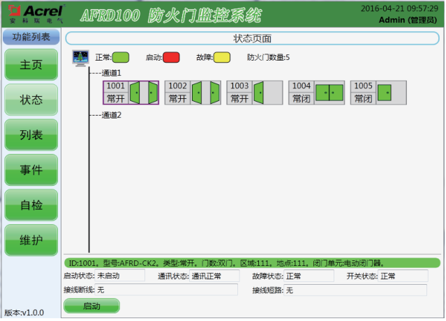 该界面以图形化显示方式直观的展现了当前被监测的防火门的工作状态,点击防火门图标后,系统会显示该防火门的详细信息。