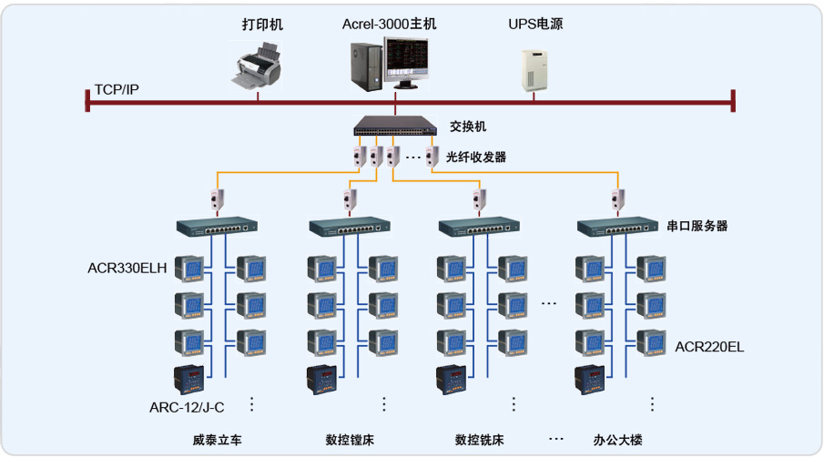整个系统采用Acrel-3000型电能管理系统,完成了对威泰立车公司、数控镗床公司、数控铣床公司、武汉善福公司、武重铸锻公司、大件加工厂、中小件加工厂、办公大楼8个单位13个配电室各回路的电能监测和管理。其中低压进线回路装安科瑞ACR330ELH,低压功率因数补偿回路ARC-12/J-C型功率因数自动补偿控制仪,其它回路配置ACR220EL网络电力仪表。整个系统采用网络分布式结构,监控主机位于10KV监控室内,系统采用开放的通讯协议,通过现场总线连接到通讯服务器 NPort5430 。13个配电室通过光纤组网与低压配电系统相连,实现数据通讯功能。