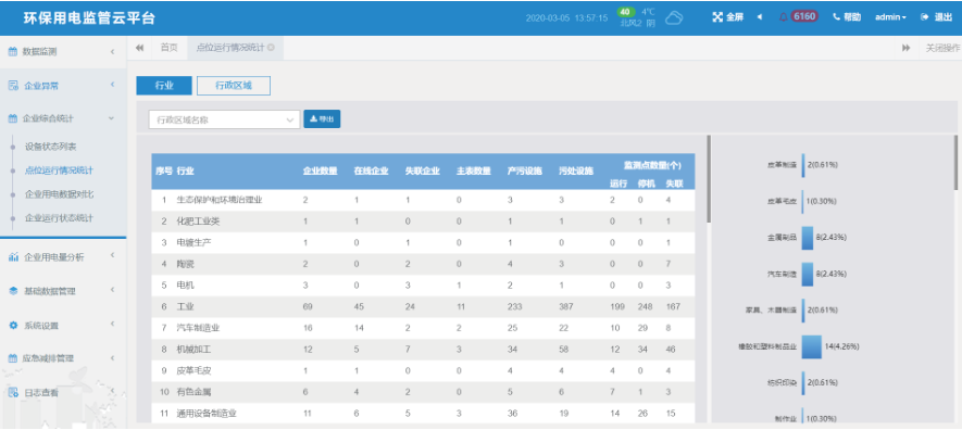 点位运行情况分析:按行业或区域统计分析企业、监测点、产污设施、治污设施等数量及运行状态。