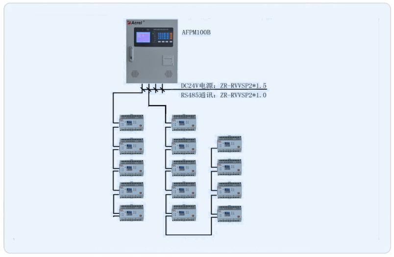 本项目承接其消防设备电源监控系统,通过对其楼层分布的20块AFPM3-2AV型消防电源监控模块的数据采集,完成在AFPM100主机的电压状态数据的实时显示、报警。