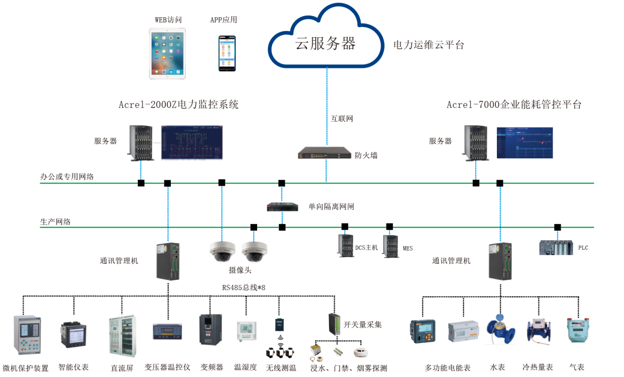 系统采用分布式结构,微机保护装置、多功能仪表、变压器温控器、直流屏、柴油发电机控制屏等设备通过RS485总线或者以太网接入智能网关,经过协议转换、数据处理后上传至电力监控系统,实现遥测、遥信、遥控、异常报警等功能。